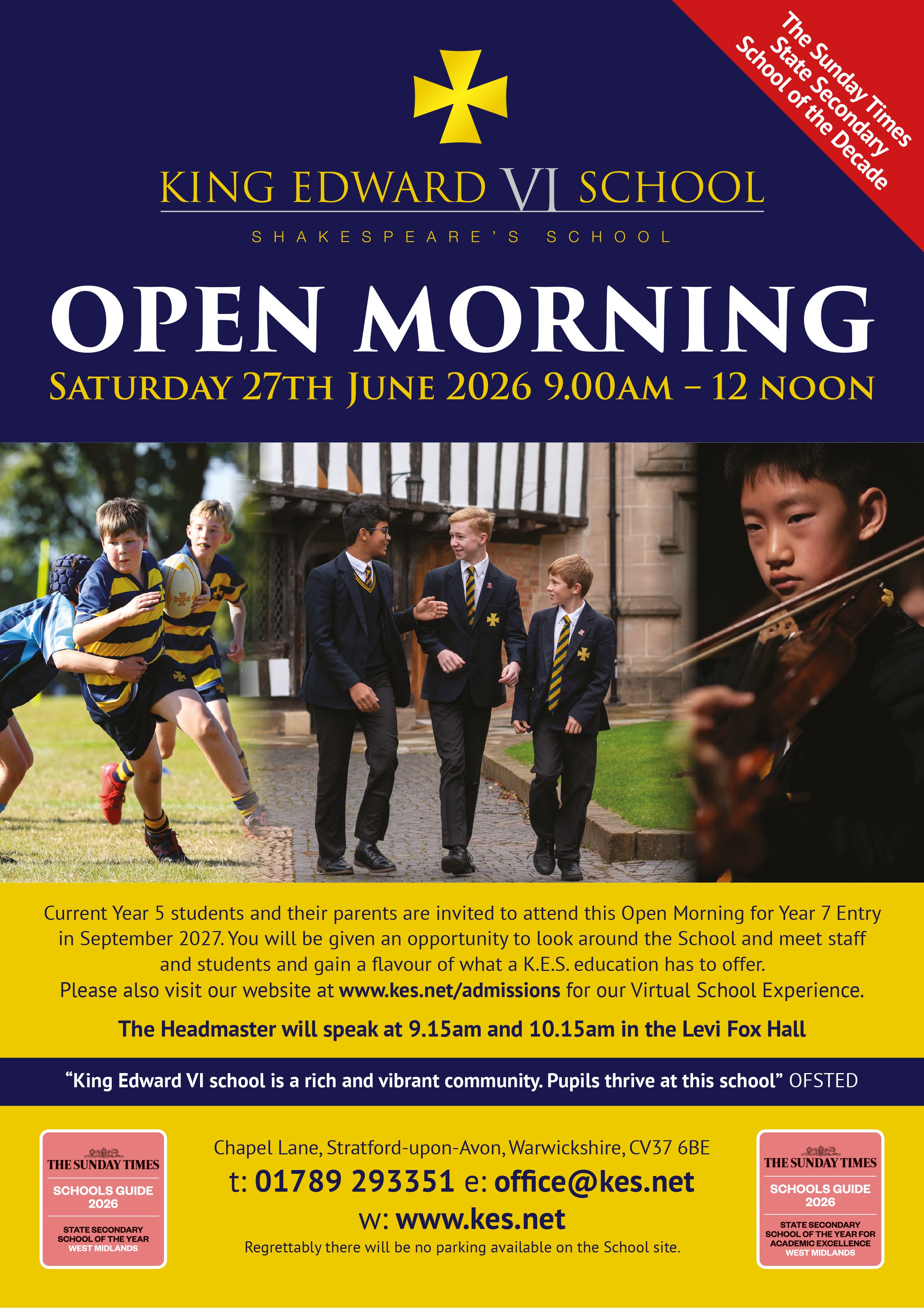 Welcome to the website for King Edward VI School, Stratford-upon-Avon. K.E.S. is a state-funded Academy Trust selective school for boys with a co-educational Sixth Form. The School, known to have been in existence from 1295 and re-founded by a Charter of King Edward VI, has a reputation for high academic standards and an outstanding co-curricular programme. The poet and playwright William Shakespeare attended the School in the 1570s, leading to our being widely known as Shakespeare's School.